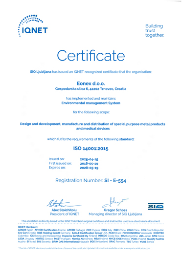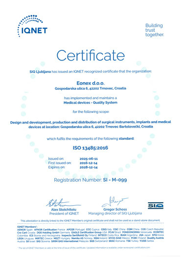 Das Unternehmen erfüllt die Anforderungen an das Qualitätsmanagementsystem für Medizinprodukte nach ISO 13485:2016. Derselbe Standard findet bei uns auf die industrielle Fertigung Anwendung, wodurch die Lieferung von qualitativ hochwertigen Produkten an unsere Kunden sichergestellt wird.